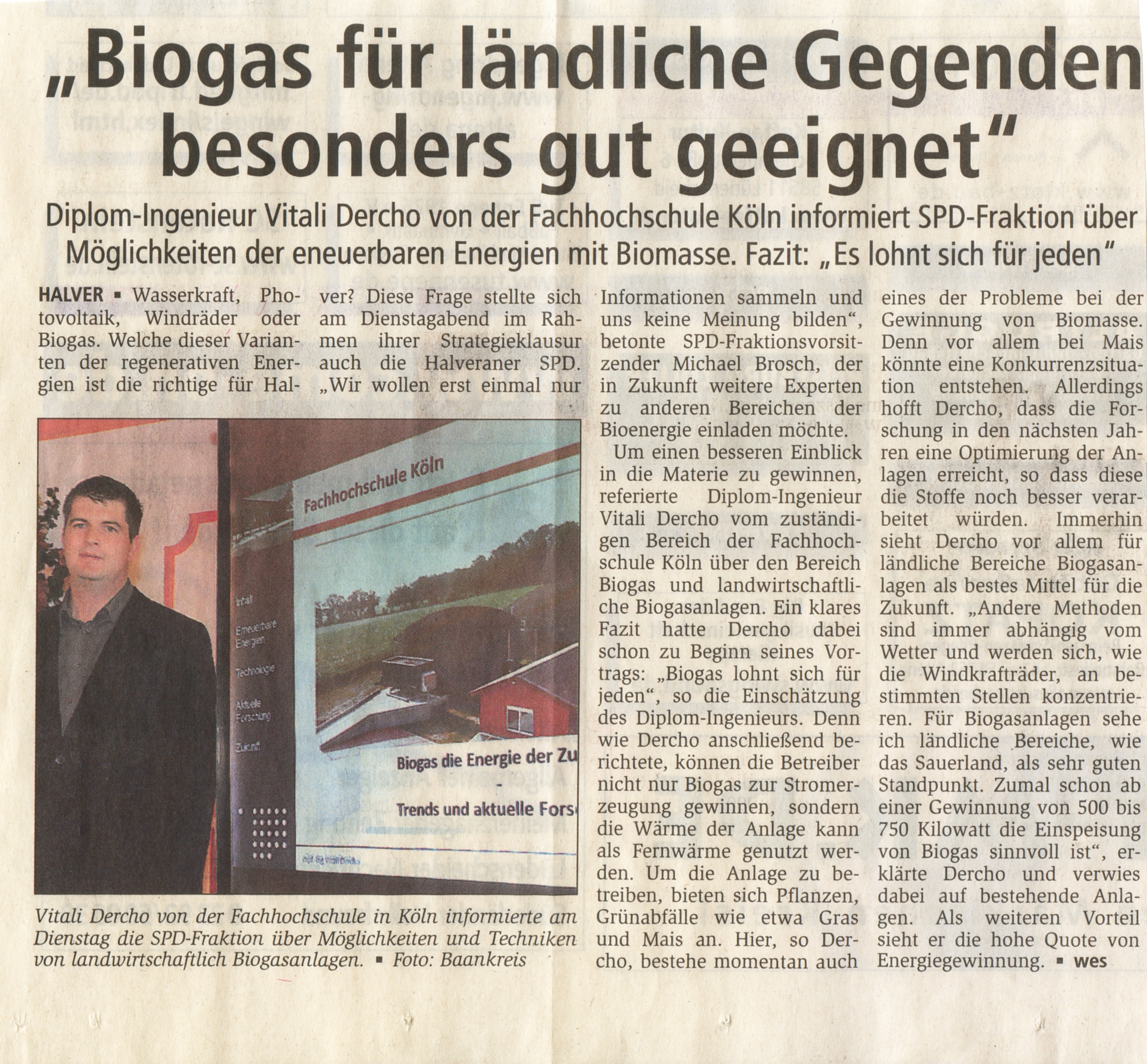 Laut Gesetzgeber soll bis zum Jahr 2020 der Anteil der erneuerbaren Energien mindestens 30% des gesamten Energieverbrauchs decken. Derzeit liegt er bei 8 Prozent. In diesem Zusammenhang liess sich die SPD-Fraktion über Biomüll als Energiequelle informieren. Dipl.Ing. Vitali Dercho, Mitglied der Arbeitsgruppe GECO►C, stellte dabei die Einsatzmüglichkeiten von Biogasanlagen in der Region vor.